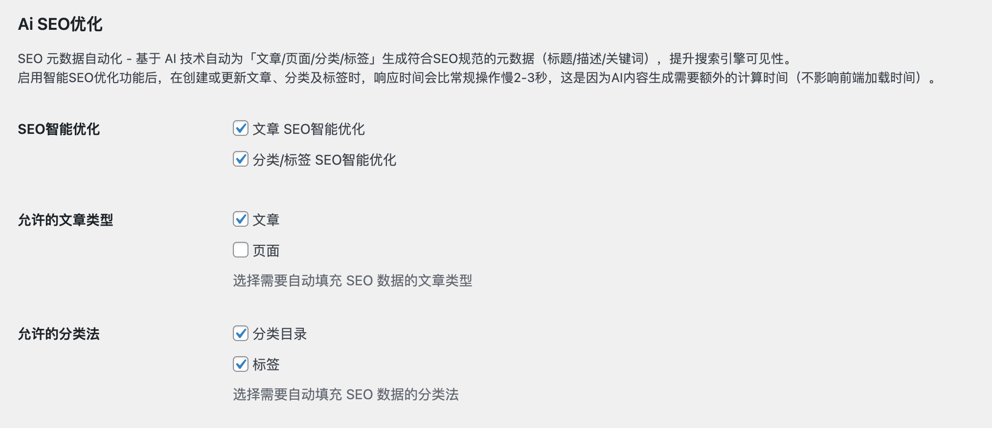 插件提供完整的 AI SEO 自动化方案,可对 WordPress 各类内容进行智能优化。
